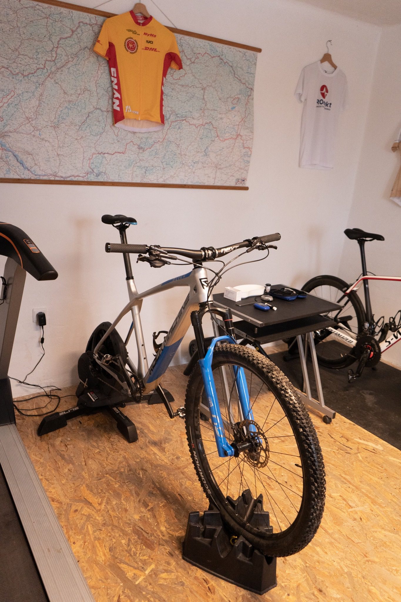 Dohodnem termín, naložím tretry, bicykel, Kristiána. Vstupujeme do malého domčeka s trenažérom, na ktorý, kým sa prezlečiem, nahodia bicykel. Dostanem hrudný pás – fíha, prvý krát v živote, Garmin na riadítka a začínam krútiť.