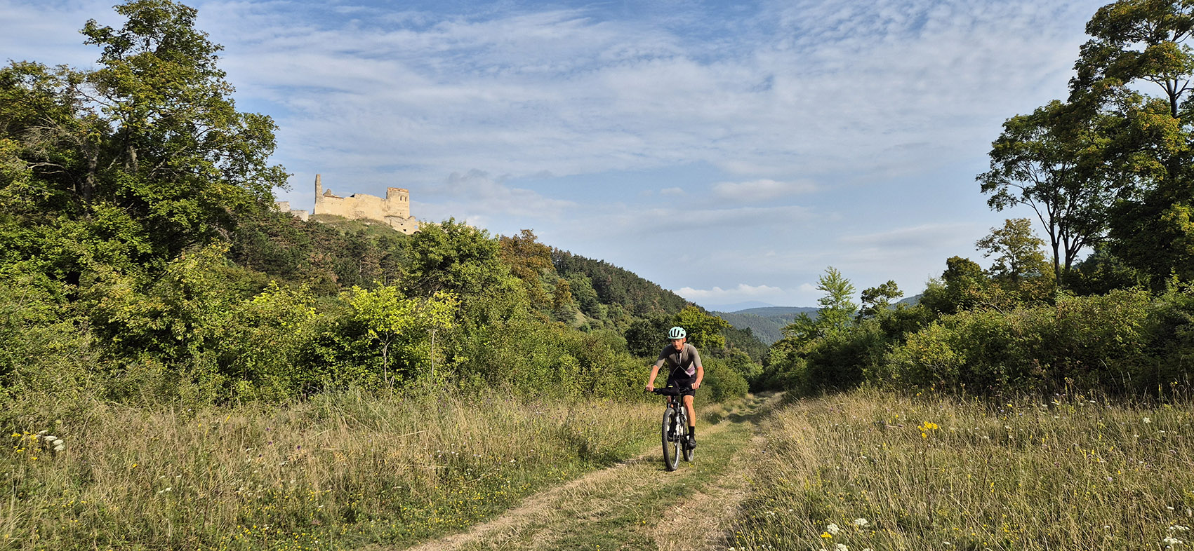 Väčšinu dňa jazdíme po pekných lesných cestičkách alebo lúkach a v tomto duchu pokračujeme smerom na Pezinskú Babu. Náš výlet sa pribúdajúcimi kilometrami pomaličky, ale isto blíži ku koncu. Všetko nasvedčuje tomu, že večerný vlak stíham, a tak si s Martinom užívame panoramatický výhľad z vrchu Somár. Zlikvidujeme posledné zásoby a s doplnenou energiou sa spúšťame hladkou cestou na Biely kríž.